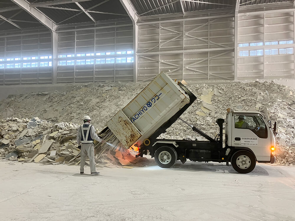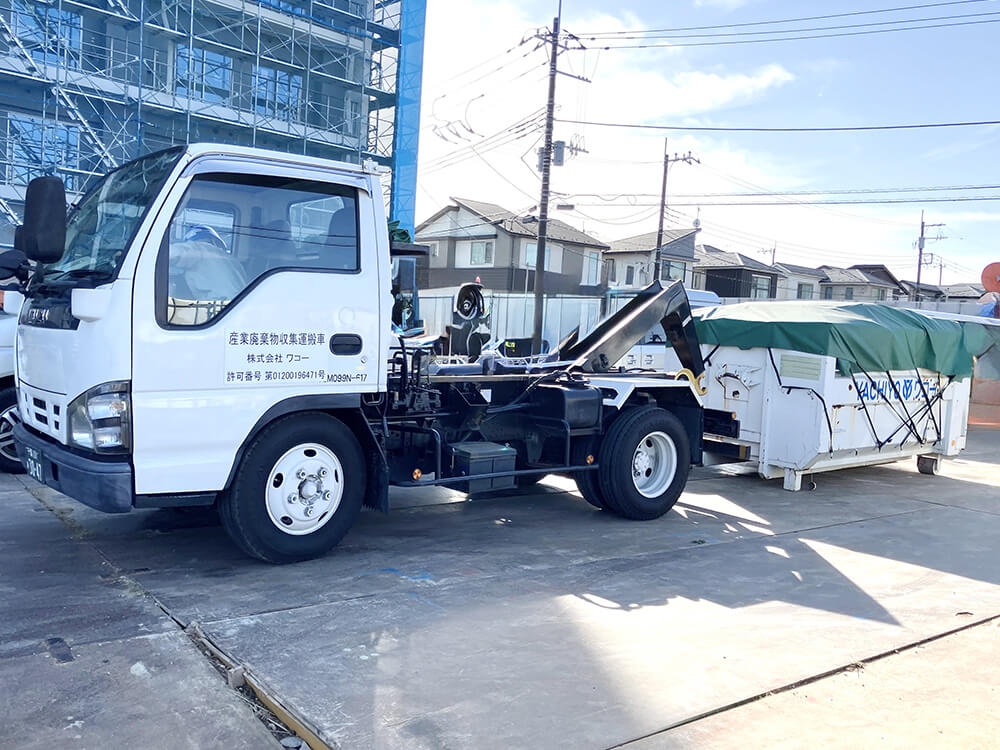 株式会社ワコーでは、脱着装置付コンテナ専用車(最大積載量3トン)を保有し、建設現場から排出される建設廃材(石こうボードや金属くず)を、自社で適正に収集・運搬・処理しています。
